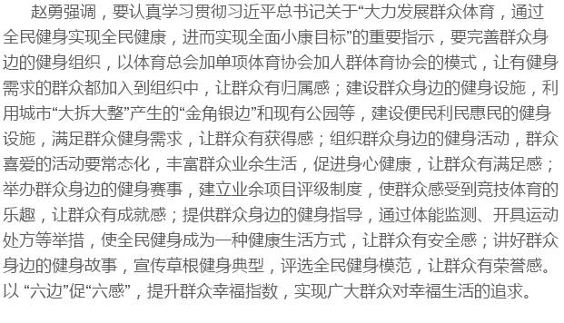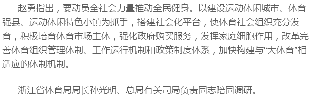 2月3日至4日,春節后一上班,國家體育總局副局長趙勇率調研組就全民健身工作和體育社會組織建設到浙江省溫州市調研。他強調,目前已進入全民健身時代,要深入學習貫徹習近平總書記關于全民健身工作的重要指示,把“六邊”工程作為實施全民健身國家戰略的重要抓手,廣泛動員全社會力量辦體育,把全民健身計劃做成全民幸福計劃。